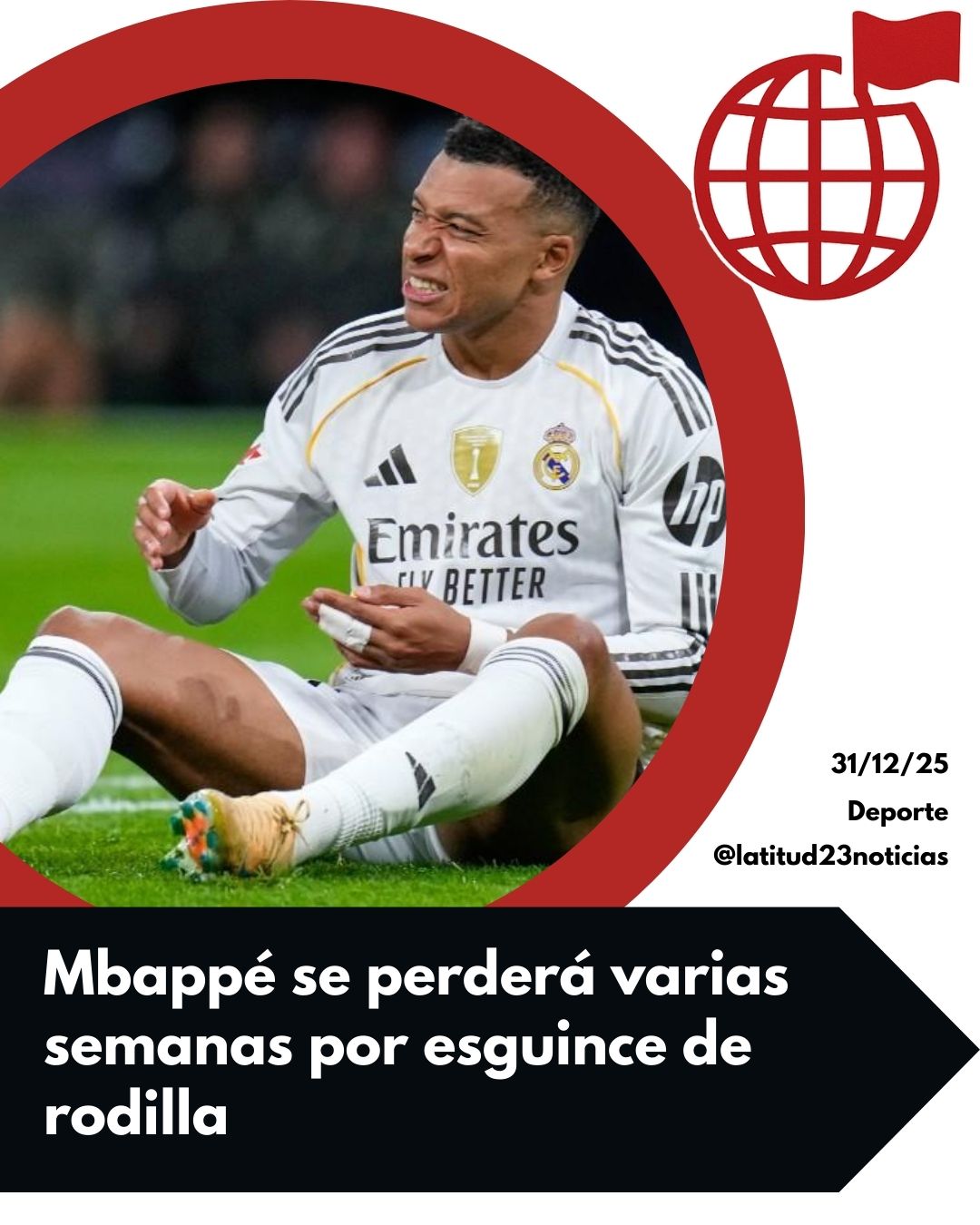 Kylian Mbappé, delantero francés del Real Madrid, se perderá al menos tres semanas debido a un esguince en la rodilla izquierda, según informó una fuente cercana al jugador a AFP y posteriormente confirmó el club blanco.