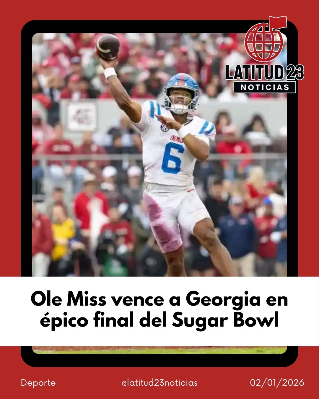 Trinidad Chambliss lideró a Mississippi con una actuación destacada, lanzando para 362 yardas y logrando dos touchdowns, mientras que Lucas Carneiro se convirtió en protagonista al convertir su tercer gol de campo del partido con apenas seis segundos en el reloj. Este último disparo puso a los Rebels, clasificados como el sexto mejor equipo del país, al frente de manera definitiva, sellando una emocionante victoria por 39-34 sobre Georgia, tercer sembrado, durante los Playoffs de Fútbol Americano Universitario (CFP) en el histórico Sugar Bowl.