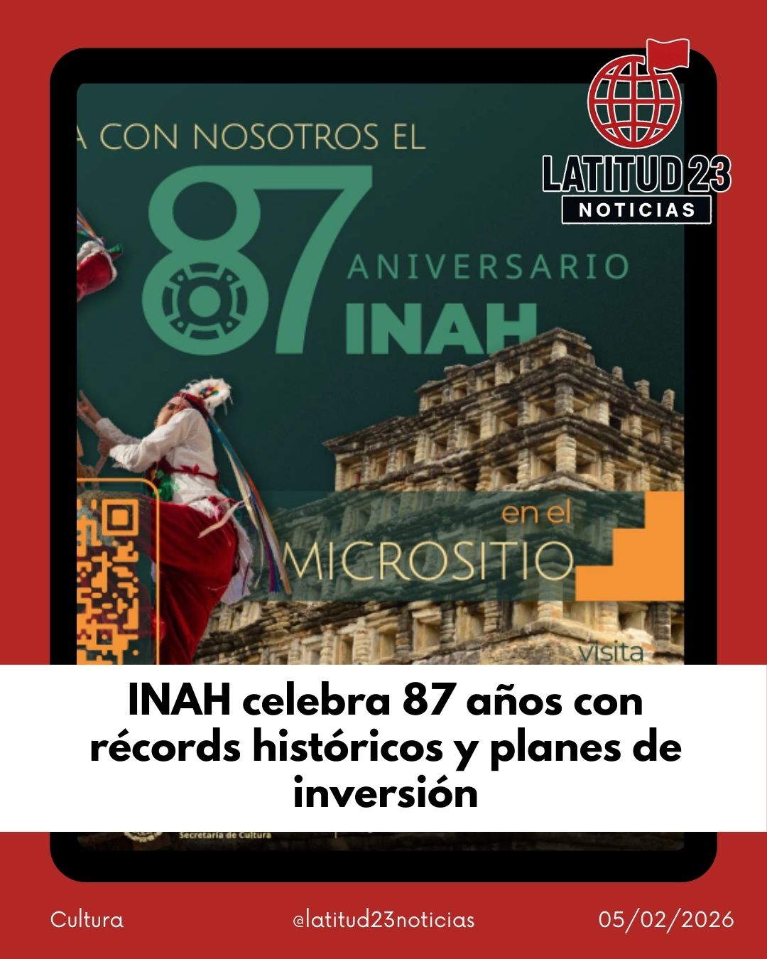 El Instituto Nacional de Antropología e Historia (INAH) celebró su 87 aniversario en el alcázar del Castillo de Chapultepec, reafirmando su vocación de investigar, conservar y difundir el patrimonio cultural de México, labor que desempeña desde el 3 de febrero de 1939.